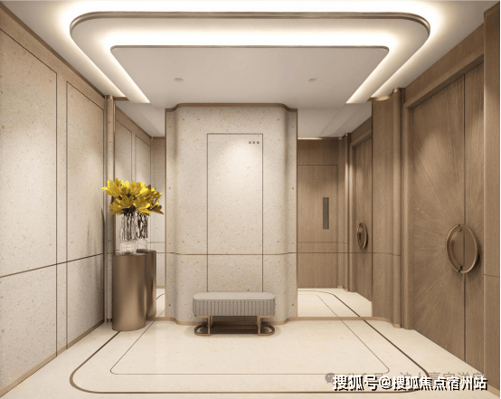 覆膜蜂窝铝板与局部石材饰面的巧妙搭配,285户型电梯厅以精致的材质肌理,演绎现代奢华的质感。黄浦江水岸元素的融入,将自然与人文的灵韵注入轿厢,赋予空间独特的文化底蕴。吊顶的优雅曲线与地面线条遥相呼应,营造出从室内到室外的流畅过渡,成就空间的层次美学与视觉延展。