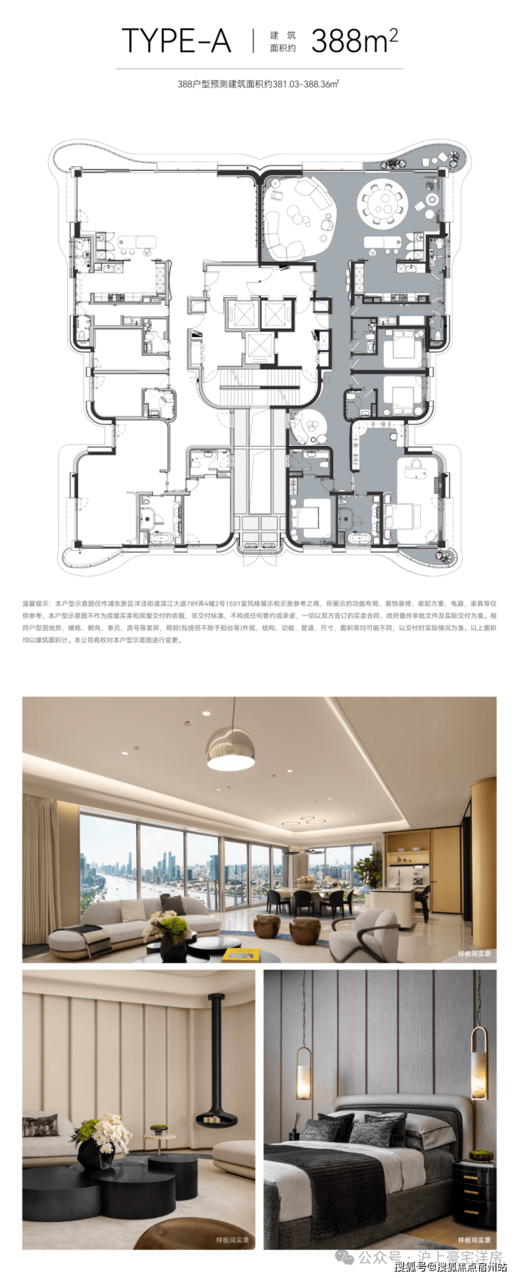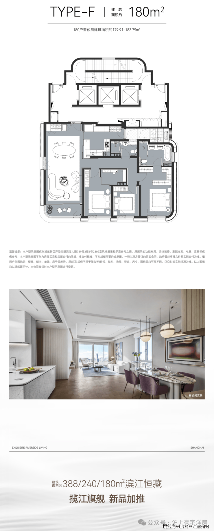 户型涵盖 180-388㎡平层江景大宅,主力面积段 200-300㎡,核心亮点在于实现 “大小户型平权”—— 打破市面上豪宅 “保大弃小” 的设计痛点,让180㎡入门户型与 388㎡顶豪户型同等享有优质尺度与景观资源。