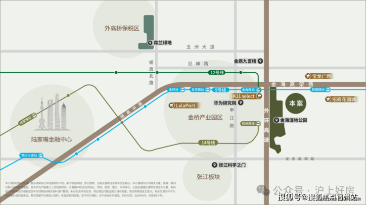 项目位于金桥东,金海湿地公园旁,9/12号双轨交汇,自驾出行的话周边有外环高速、金海高架路、往南还有龙东高架。从通勤角度来看,这是一个去陆家嘴、外高桥、金桥、张江都很方便的地段,可覆盖的人群非常广泛。