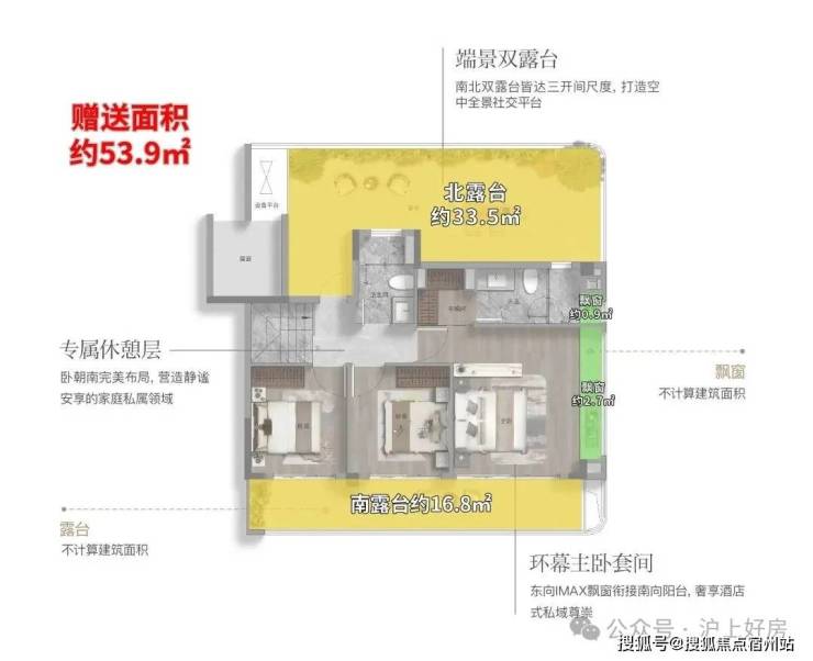 建面约144㎡的上叠产品,通过巧妙的 、 总计 15㎡露台灵动空间 设计,让户型的 实际可使用面积高达约180 ㎡,实得率约125%。