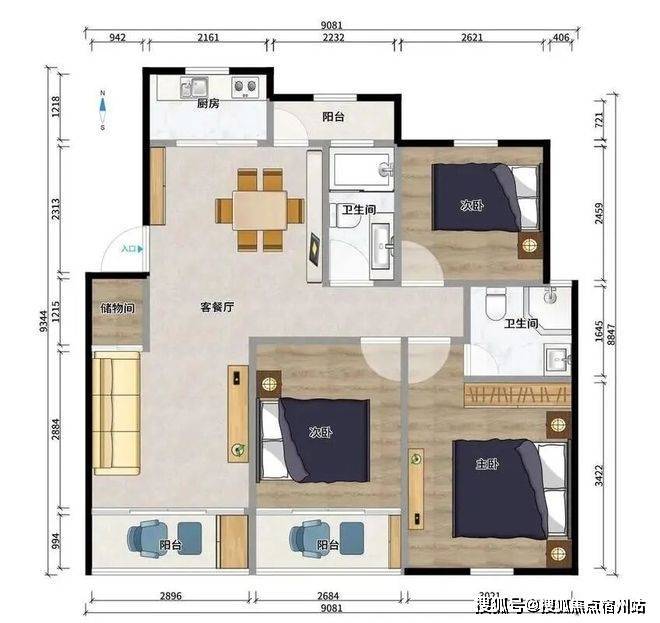约98平方米三房两厅两卫: