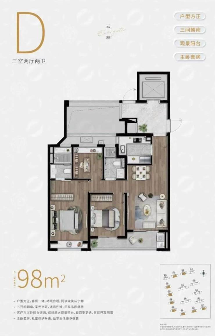 实用性方面,户型3房3卫、南向双套房的设计,可以保证每个家庭成员都能拥有更具私密性的居住空间。