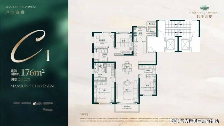 建面约176㎡4房2厅2卫户型