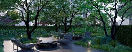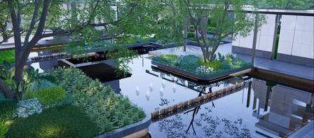 摩登水院 :中央核心景观区,以镜面水景、艺术雕塑、乌桕林营造静谧水院,华灯初上,光影倒映水中,尽显海派雍容华贵。