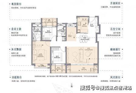 约 141㎡ 4 室 2 厅 2 卫(进阶改善) 南向超大面宽,横厅设计,景观视野无敌。双套房配置,主卧与老人房均为独立套房,兼顾家庭成员私密性;独立家政间设计,优化家务动线;三阳台 + 多飘窗结构,空间延伸感强,室内明亮开阔,适合追求极致尺度与品质的高端改善客群。