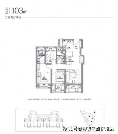 约 103/105㎡ 3 室 2 厅 2 卫(爆款主力) 项目明星户型,三开间朝南,南向面宽约 9.6 米,客厅连接宽景阳台,采光通风俱佳。LDKB 一体化设计,客餐厅通透开阔;双卫配置,主卧套房带独立卫浴与飘窗,私密性强。三阳台 + 花池设计,延伸室内空间,收纳充足,是浦东罕见的 “神户型”,深受改善家庭青睐。