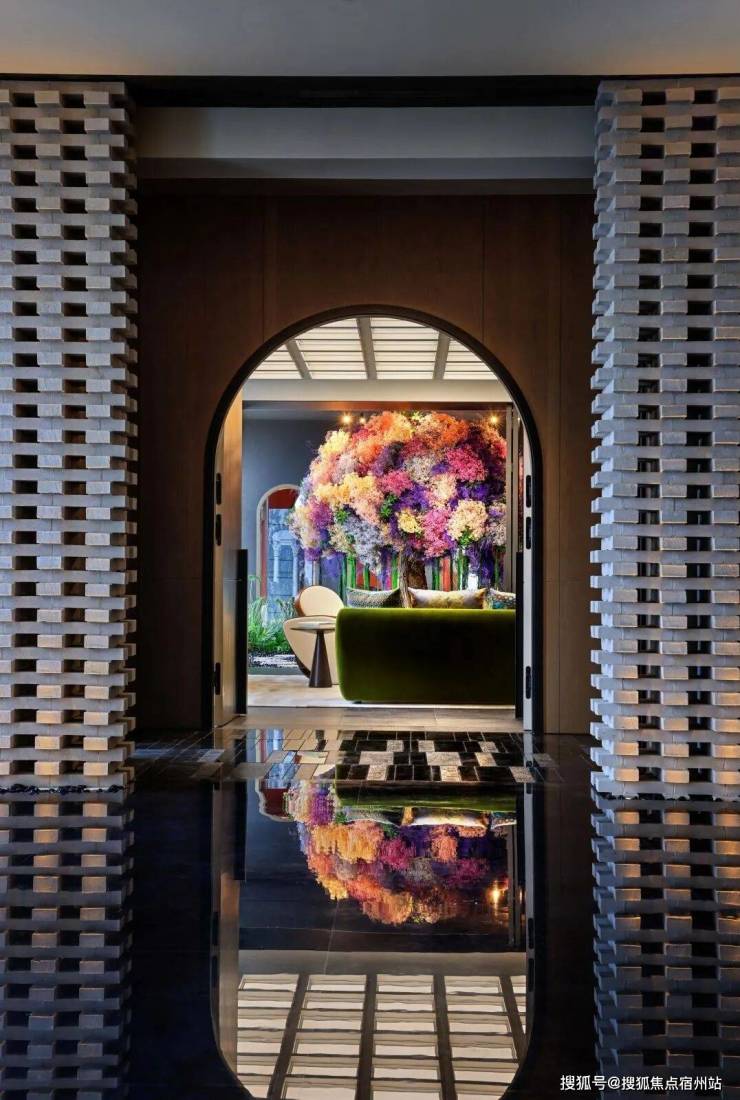 「无界空间」:客厅270度转角无柱设计,搭配落地玻璃,开阔视野将院中风景迎入日常。