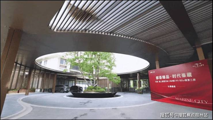 华发·海上都荟的 主入口做了环岛式酒店大堂设计,风雨回廊在天气炎热或者下雨天时让人更舒适,融合了酒店的精致感、艺术感,给人仪式感的入户体验。