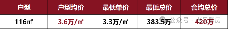 从一房一价表中我们可以发现:建面约116㎡的户型共计首开96套,户型均价更是仅约3.6万/㎡!