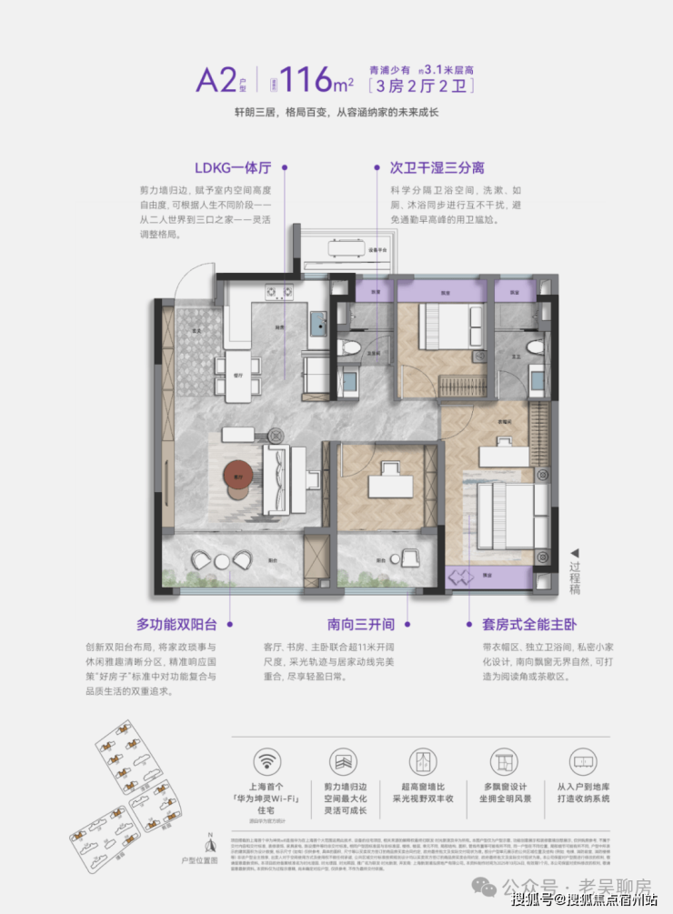 标配华为智能门锁,行业领先的掌静脉解锁技术;全屋覆盖上海首个华为坤灵Wi-Fi6智慧入户,信号无死角。