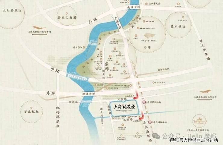 「上海桃花源」位于浦东的闵行区浦江街道,是前滩板块旁的首席配套居住区,开车听两首歌的时间就能到前滩,再听一会FM101.7上海流行音乐广播就能到达人民广场、南京西路、百年外滩、陆家嘴国金中心、淮海路IFC、新天地商圈、联洋碧云国际社区、徐家汇恒隆广场,可以说是融合浦西浦东真正精华的地段!