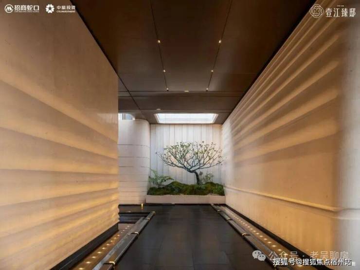 穿过门仪,核心景观是超千方镜面主题水院。安哥拉黑石材打底,水深控制在5-10公分,倒映天光云影。水面上透光云石板仿铜纹灯具,如星光落入水面。水景中嵌入三株原生丛生乌桕作为点缀,视觉精致而丰盈,是团队从千余棵苗木中挑出来的,四季色彩不同。