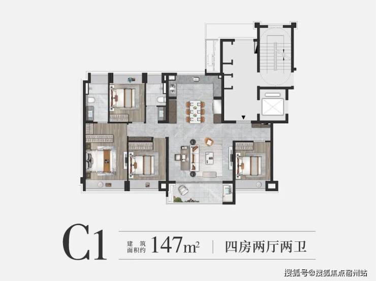 如果家庭有二孩或者三代同堂需要的,那建面约150㎡的四房大平层一定要优先加入您的“购物车”,标准的“大面宽短进深”的黄金户型格局,直接让人竖起大拇指: