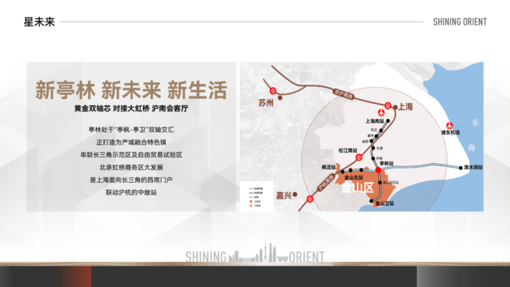 双轨加持——距离金山铁路亭林站约2.5km,5站到上海南站,轨交南枫线(规划)串联上海南部客流主动脉