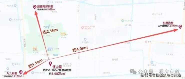 以人民广场为中心,向外辐射35KM左右的别墅产品单价普遍在 4.5万-8万/㎡ ,怀山望仅 约3.98万/㎡ !