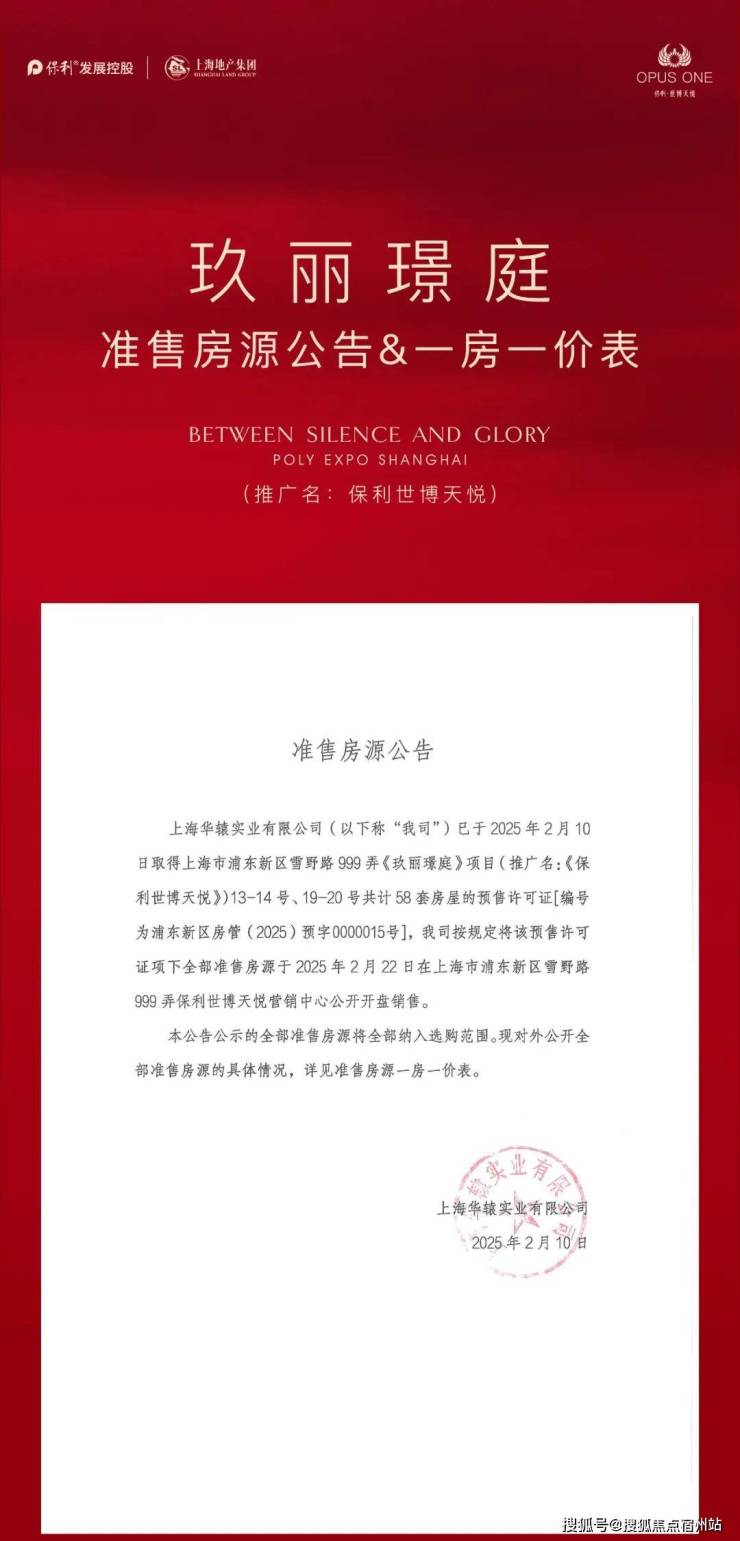 1、项目推广名为“保利·世博天悦”,地名核准名/备案名为“玖丽璟庭”,开发公司为: “上海华辕实业有限公司”;预售证号:浦东新区房管(2025)预字0000153号; 2、本资料为要约邀请,不作为要约或承诺;3、相关宣传内容不排除因政府相关规划、规定及出卖人分期规划、未能控制等原因而发生变化;4、买卖双方的权利义务以双方签订的商品房买卖合同及其补充协议、附件等书面文件为准;5、本宣传材料所涉及户型仅供示意参考,具体以政府部门最终审定的图纸和销售合同为准,本资料所涉及面积皆为预估面积,相同户型单位因楼栋、楼层、单元等差异,局部结构、形式、面积、装饰等可能有所不同,且预估面积与实际面积可能存在差异,面积最终以房管局测绘为准。户型图中装修、家具、电器等设备仅为示意,不属于交付内容和交付标准,实际部品的选型和房间空间尺寸根据户型情况,略有差异,以现场实际为准;6、本宣传资料中涉及的价格、折扣、付款方式等信息,因销售时间、户型楼栋、楼层、方位等不同有所差异,以双方签订的商品房买卖合同及其补充协议、附件等书面文件为准;7、本资料所发布的内容为2025年6月的信息,敬请留意最新资料。