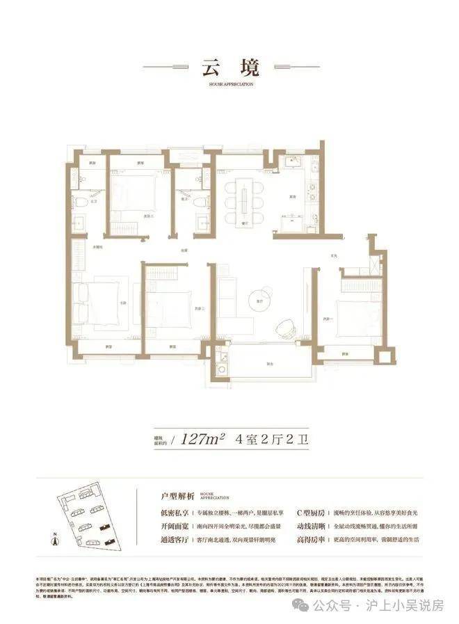 建筑约127㎡的「云境」空间内, 四开间南向结合舒朗的方厅,大尺度的面宽让光赋予了生活更多的灵感。 厨房U形台面,尽情挥洒味觉灵感, 一体化的客餐厅创造更丰富的用餐、社交场景,从西式brunch到日式omakase,尽享味蕾的欢愉时光。 一梯两户的入户,搭配轩朗的玄关,让每一次归家,都更从容......