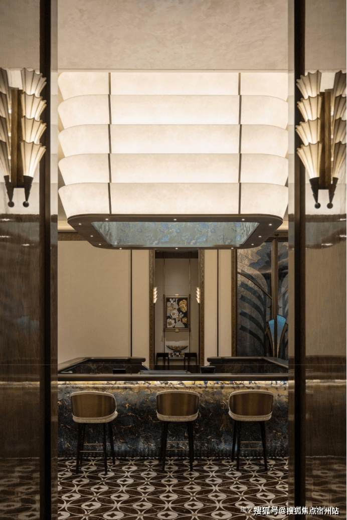 萃取东方色谱精粹,建发·海宸甄选丝箔流金、东方雅铜,青釉奢蓝,以当代笔触晕染立面,令传统色彩在空间生长为永恒的诗意, 「入户门头」 形取和平饭店经典拱门,配以碧绿色天然石材门套、彩玻花窗,重现百年外滩门廊的尊崇仪式。