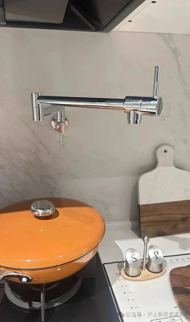 厨房超大柜体的收纳空间,包括调味拉篮、岛台双面收纳,将厨房空间直接扩容约80%,贴心的灶前龙头设计,开火时直接上方接水,非常灵活;