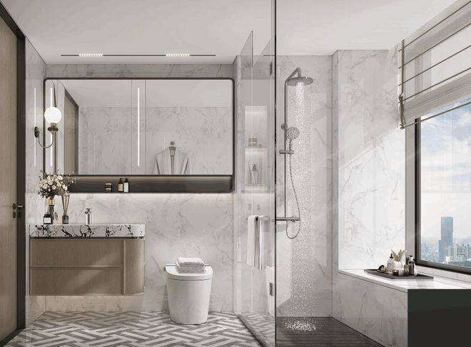 卫生间的收纳更是创新!双卫配置大容量镜柜并增设置物台提升实用性;公卫通体收纳柜,细枝末节的杂物均可一并容纳!☑️☑️华润华发时代之城售楼处电话:400 - 8377 - 020☑️☑️