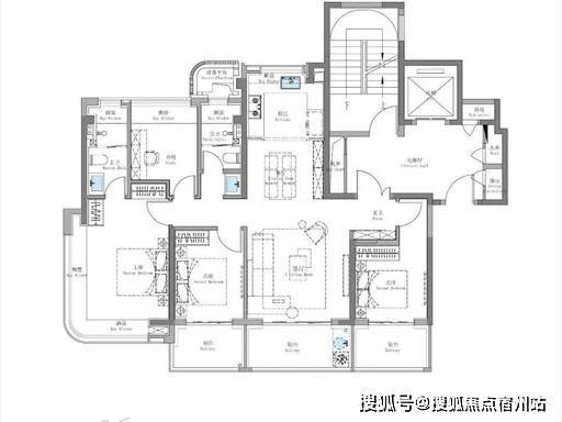 边厅设计 + 超大面宽,KDLB 一体化(厨房 + 餐厅 + 客厅 + 阳台),公共空间开阔通透,互动性强。