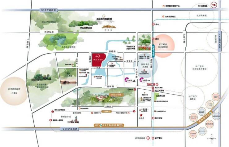 生态环境项目西侧约800米是4A景区广富林文化遗址、广富林郊野公园,项目北侧约2公里处辰山植物园、佘山旅游度假区、欢乐谷等等,是休闲娱乐的好去处。