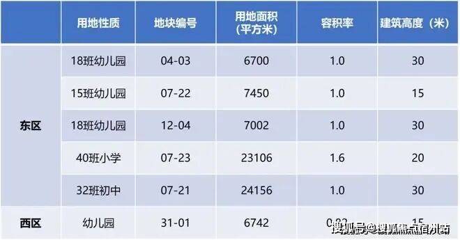 东区和西区最大的不同在于教育和公建设施配套,东区人口更密集,有5幅教育用地,从幼儿园至初中;而西区仅有1幅教育用地,作为幼儿园。