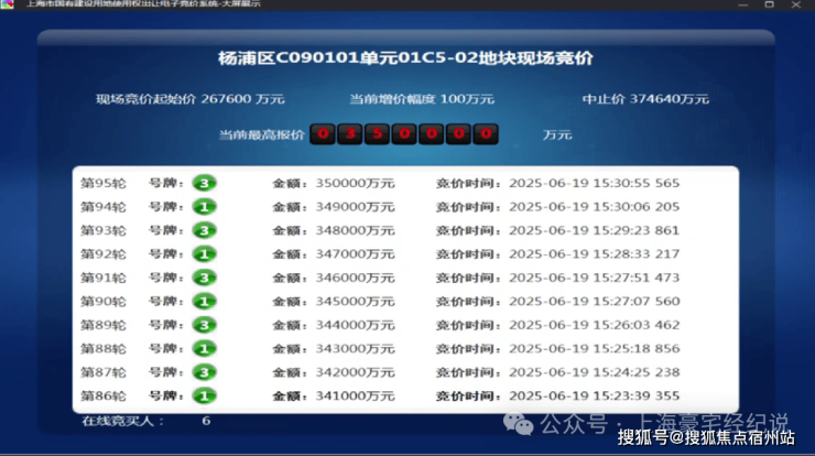 6月19日,保利发展经过95轮竞价摘得杨浦东外滩地块,成交总价350000万元,楼板价95530元/㎡,溢价率30.79%。