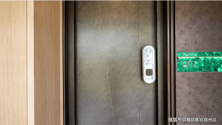 入户门采用铸铝门,安全与颜值兼备。大门的门禁、指纹密码锁等功能被巧妙的隐藏在可移动式门把手之下,使得入户门立面纯粹完整;右侧门牌号在绿色石材的衬托下显得设计感十足。
