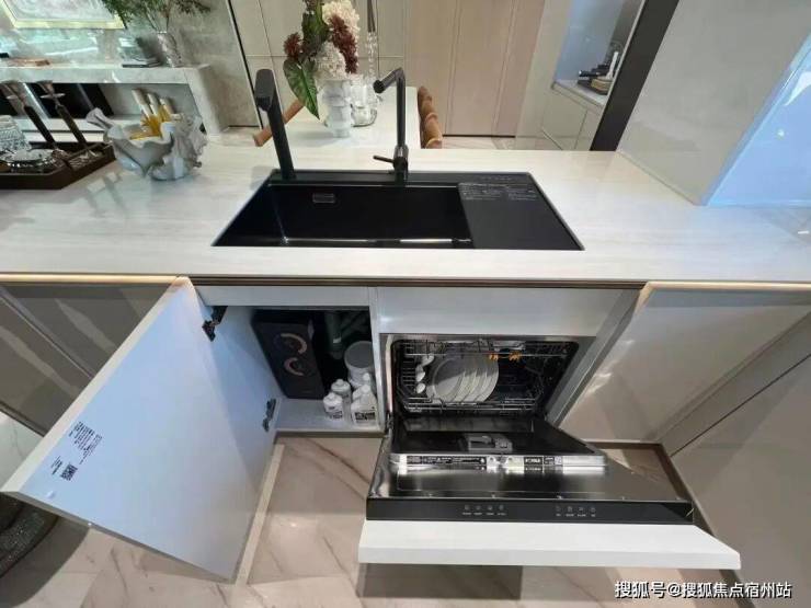 厨房开放式设计,搭配全套方太零售高端集成厨电,包含烟机、灶蒸烤烹饪机、净洗中心,更有市场价万元以上的方太母婴级净水机。