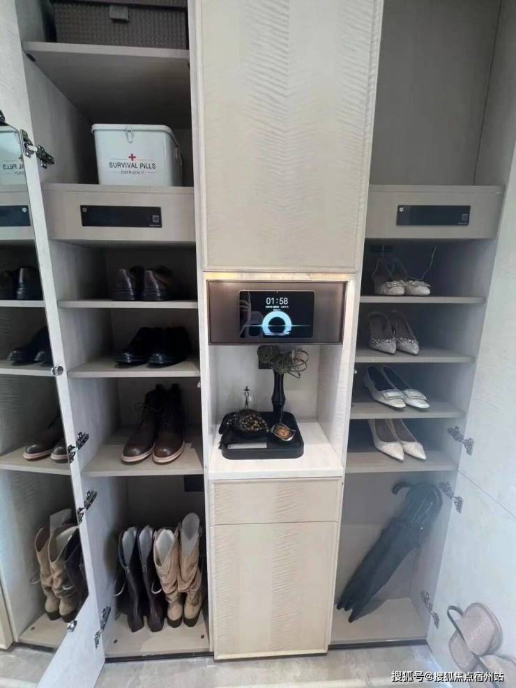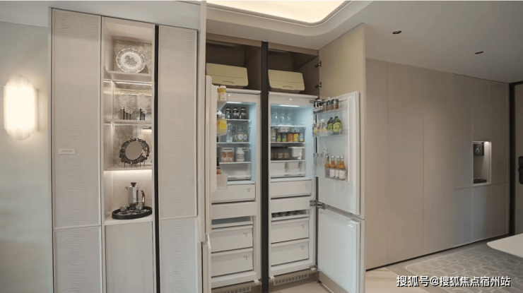 玄关颜值拉满,还巨能装,一家人的当季鞋子和零碎杂物全能“隐形”收纳,真正实现了“进门零杂乱”,东芝/卡萨帝双开门冰箱也利用S墙的设计,完美融入收纳系统中。