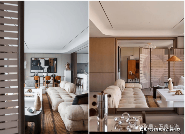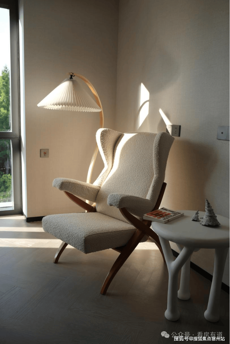 样板间的设计本身就是「静谧与光辉」的具象:约8.8米江景会客厅的窗前,黄浦江景如一幅流动画卷,成为展览最天然的“动态展品”;室内以米白、暖棕为主调,搭配原木纹理的家居艺术品,营造出「静谧」底色;而设计师精心布置的灯具,在夜晚与窗外霓虹、粼粼波光相呼应,形成「光辉」的对话。