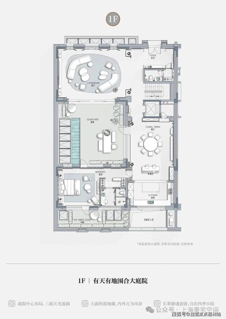 庭院中心布局,客厅、餐厅、卧室三面均可采光,内外相映成趣