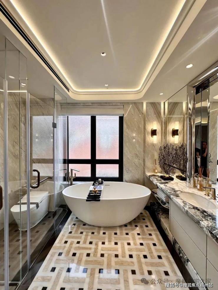空间美学上,精选米白色西伯利亚石材与拉丝镀黑钛不锈钢材质,营造出堪比五星级酒店的豪奢空间;