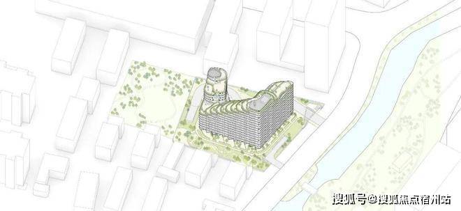平直流畅的建筑线条回应周边城市肌理,也完好保持了城市界面的统一和谐;而内部柔和顺滑的几何元素则是对自然的互文。除了逐层退让的设计以外,设计将东西向的住宅旋转45°以满足上海住宅户型对朝向的规范。在日照包络线和规避自遮挡的调节下,建筑轮廓线精准生成,这不仅解答了种种场地条件提出的考验,也在日光的自然雕琢和毫厘精细的人工共同作用下,让建筑映照优越的江景,熠熠生辉。