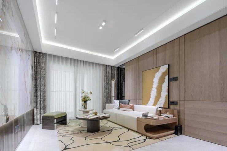 客厅背景墙岩板,客厅采用金属踢脚线,提升整体质感;