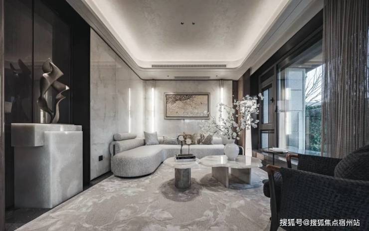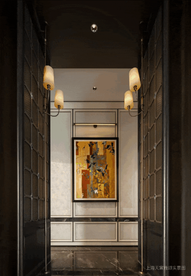 门厅 , 作为建筑空间的第一重呼吸,在摩登且包容的主基调上,汲取 西方古典园林的轴线秩序感, 同时在细节处融入了东方留白的智慧,并以黄金比例分割的线条韵律与考究材质的肌理对话,让这个过渡空间成为兼具当代美学精神与人文温度的仪式场域,让居者于此处完成从外部世界到内心居所的优雅转译。