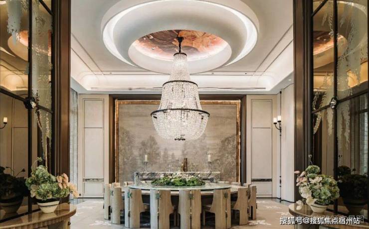 在景观落地窗环绕中,私宴厅以 “ 花廊序列,美学对景” 构筑专属的私谧空间,巨型水晶吊灯与浅色饰面的搭配,色彩质感上相得益彰,营造融合艺术、文化与生活美学的奢享感场域,成就令人神往的优雅社交范式。