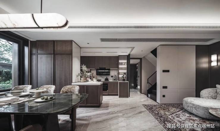 首先厨房是半开放式的岛台,让整个公区的视野更开阔,尺度更具豪宅气度。其次敞开式的厨房能让家人沟通更顺畅,温馨感提升。
