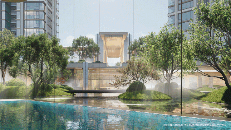 穿过园林,上海最大的约3500㎡下沉水院构成社区的核心灵魂,约13米的高差形成独特的“峡谷绿洲”,将黄浦江的水意象引入社区,中央平静水面与四周的会客舱、茶室、游泳馆形成呼应。