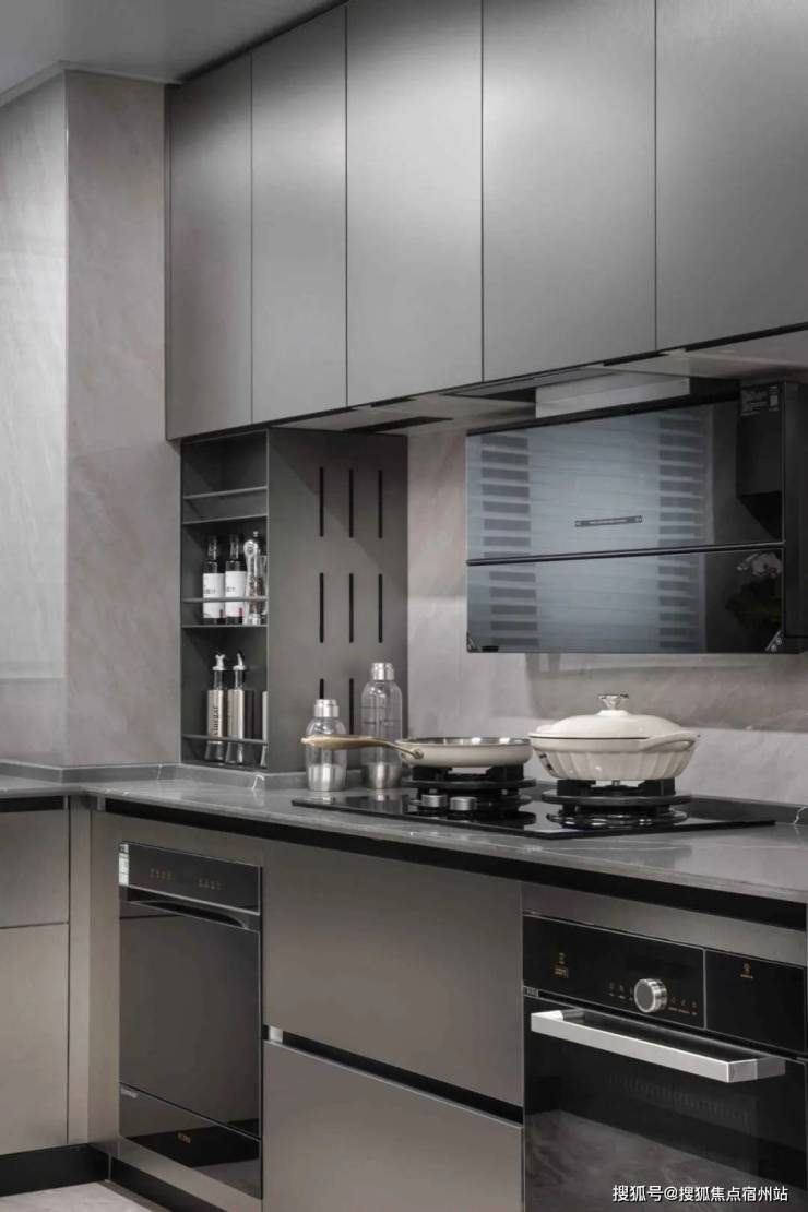 客餐厅厨一体化,U型厨房设计。标配厨房七件套,包括:洗碗机+侧吸油烟机+燃气灶+蒸烤一体机、线性凉霸、末端净水、双开门冰箱!连调味品收纳架也是交付的,完全可以实现拎包入住!