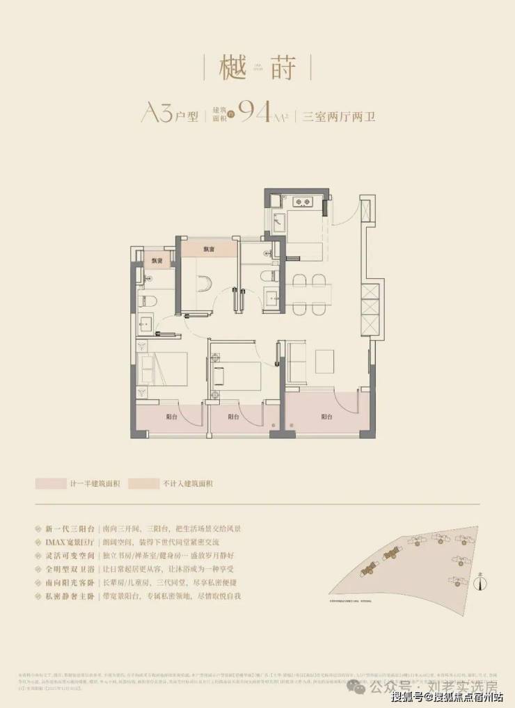 大华望樾建面约94㎡高层户型居然做到了 三阳台 的配置,远远超过新规标准。