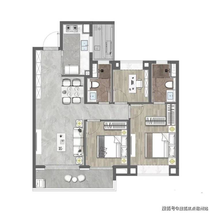 该户型做到了三开间朝南+超大面宽横厅+主卧套房设计+卫生间干湿分离+南北通透,功能性和尺度感完美结合。