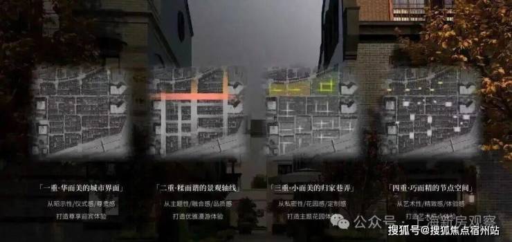 四重景观空间 层层递进的隐居哲学从城市界面到节点空间,由大到小打造“四重空间感受”,营造中西和鸣的感官体验。从华而美的城市道路、糅而谐的景观轴线,美而精的归家巷弄、雅而巧的节点空间,每一处场景皆实现私密与艺术的交融,感受城市繁华与归家宁静的交叠。