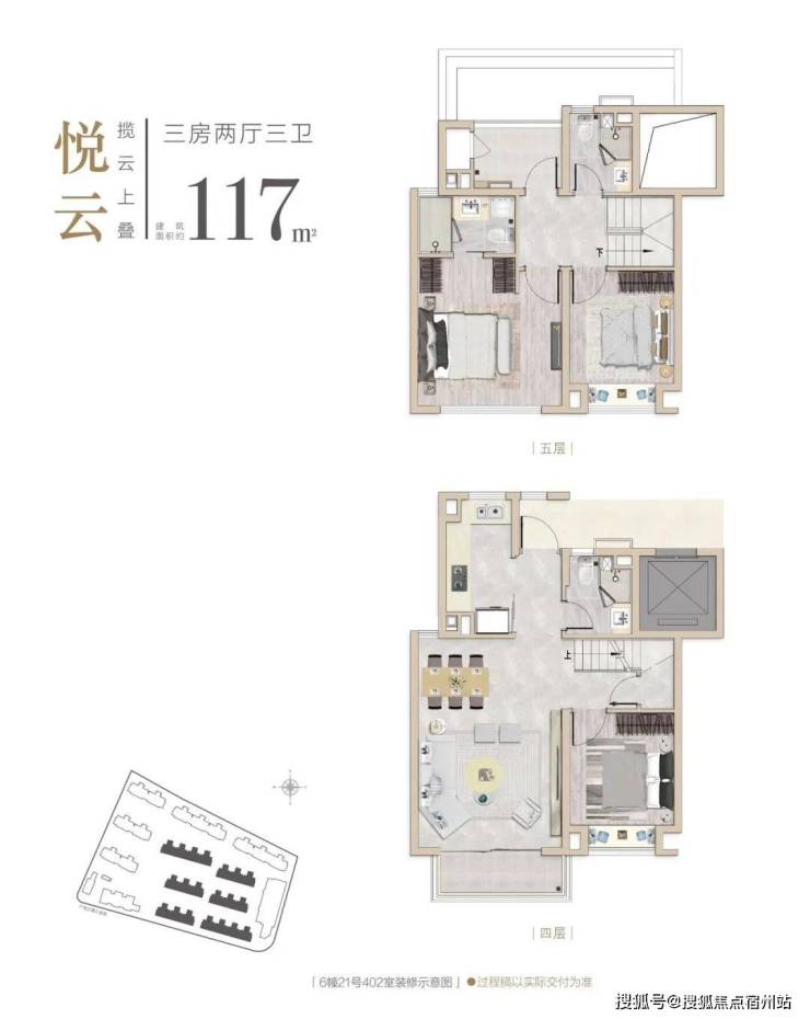 上叠面积约117㎡,与下叠相比,上叠一楼 客厅的南侧为露台 ,不计入建筑面积, 楼上的北侧房间变成了家务空间 ,其它空间与下叠都一样。但上叠 最大的好处是私密感最好 ,位于整个楼栋的顶楼,没有楼上住户带来的噪音烦恼。且 南向的视野非常好 ,12#距大淀湖最近仅约230米。