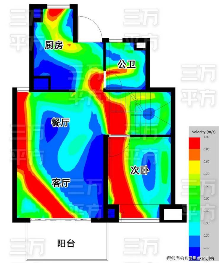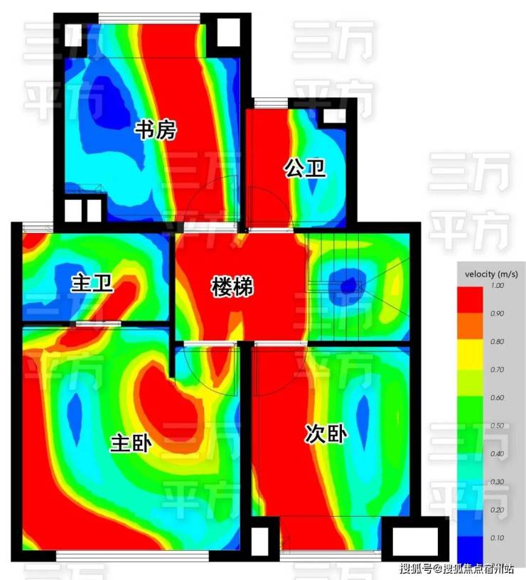 餐厅北侧有开窗,具备了 南北通风 的良好条件,下图是模拟在春夏季东南风的环境下,户内的通风情况,颜色代表风速,红色最优,蓝色基本静止,箭头代表流动的方向。 由图所知,主要房间的通风情况都很好。