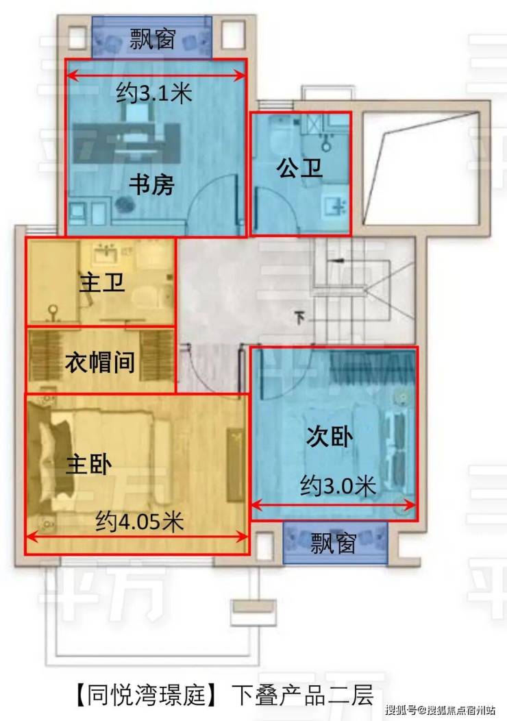主卧套房 设计,约 4.05米面宽 , 空间宽敞,四件套主卫并预留步入式衣帽间的空间 , 收纳空间大 。 南向次卧 面宽约3米, 附带飘窗 ,可作为 儿童房 。 北向房间 面宽约3.1米, 附带飘窗 ,可作为 独立书房、客房 ,也可以与主卧合并,形成超豪华“小家化”的主卧套房。