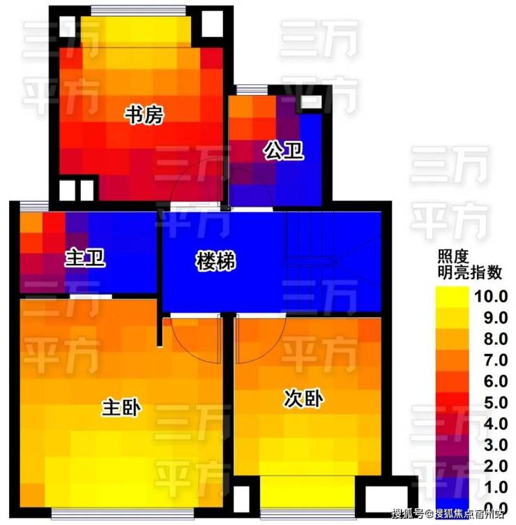 约3.2米层高,采光极好。 三万平方也做了专业的采光分析,如下图所示,颜色代表亮度,黄色最亮红色一般蓝色最暗。可以看到在白天,主要房间 靠自然光线就可以很明亮 ,幸福感立涨25%。