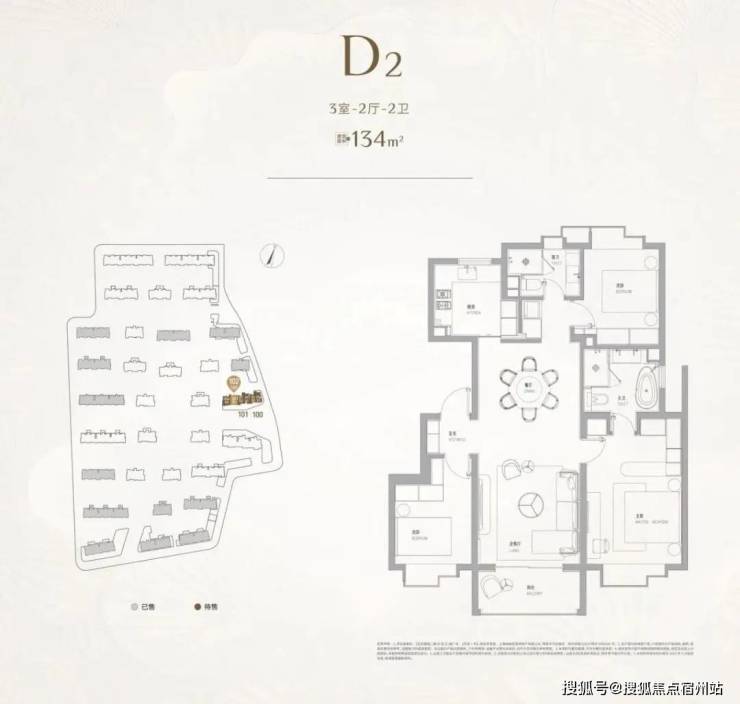 建面约134㎡3房,几乎可以看做是双套房的设计,尤其是主卧带浴缸和双台盆,保证了各个家庭成员的私密空间,适合一家三口的改善之选。