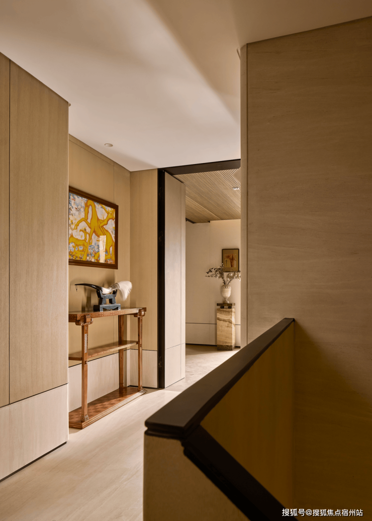 由三楼一整层打造供主人独享、使用的空间场景,在生活起居上关注静谧与私密性。“人字形”屋顶挑高处理,搭配深色木饰面构建柔和、沉稳过渡,保持整体色调平和的感受时,更流露出一种宁静、从容。